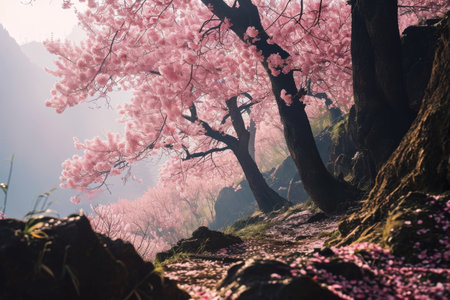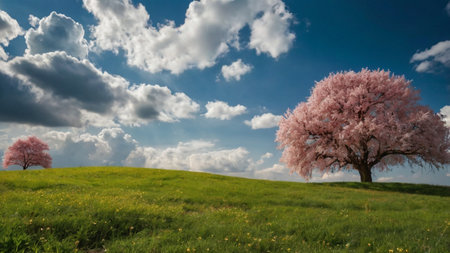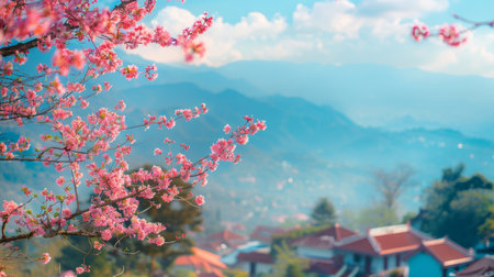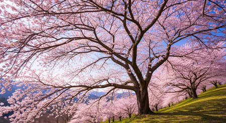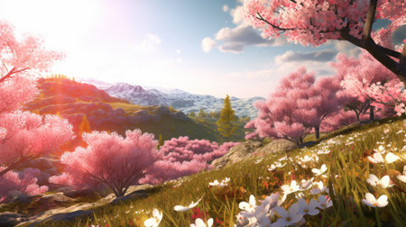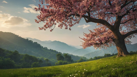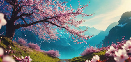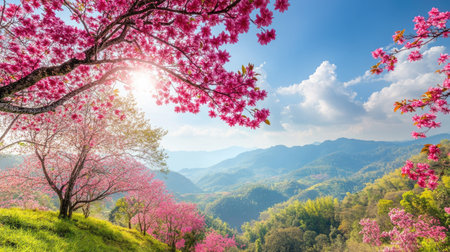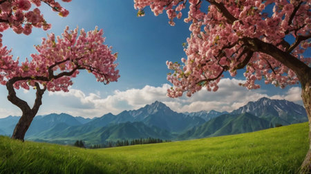 Captivating scene of blooming cherry trees in a vibrant mountain landscape. The beautiful pink flowers contrast beautifully with the green hills and blue sky.
