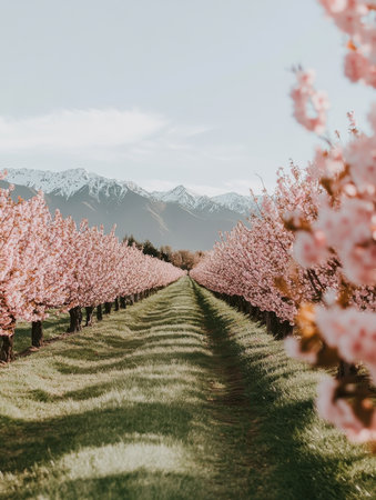 Serene blossom orchard leads to distant snow-capped peaks under a bright sky.