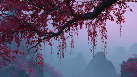 An image showcases a tree branch laden with crimson leaves, their delicate forms contrasting against a hazy mountain backdrop. The color palette incorporates shades of red, purple, and blue, creating an ethereal ambiance. This composition offers potential applications in various fields such as design or illustration for diverse commercial purposes.