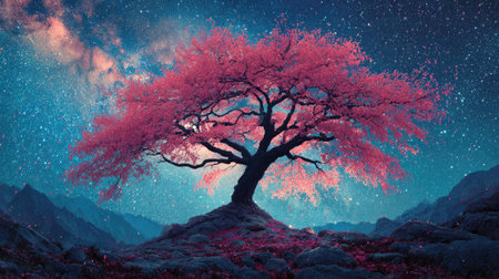 A majestic cherry blossom tree stands alone under a mesmerizing night sky filled with shimmering stars and a vibrant nebula. The scene captures tranquility and beauty in a dreamlike setting, perfect for art and nature lovers.