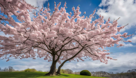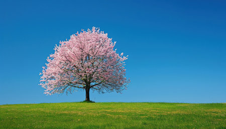 A single cherry blossom tree in full bloom standing in a vibrant green field under a clear blue sky