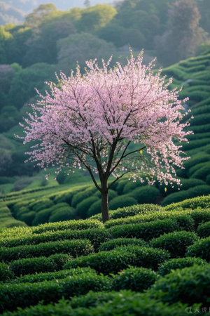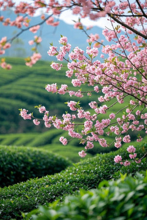 Tea Garden and Cherry Blossom Tree Natural Scenery
