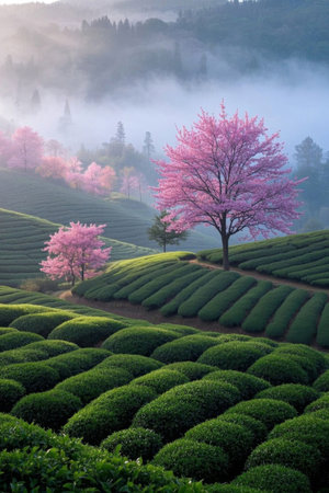 Cherry blossoms in the morning fog over the tea plantation.