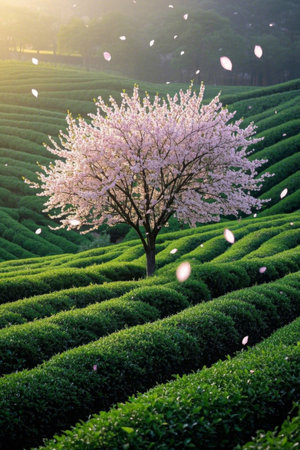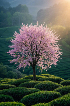 A single cherry blossom tree with vibrant pink flowers stands out against a backdrop of rolling hills covered with tea plants. The early morning light gently illuminates the scene as a light mist weaves through the landscape, creating an ethereal and tranquil atmosphere.