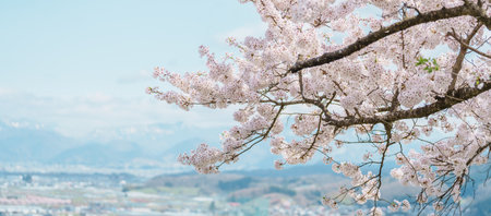 cherry blossom tree with blue sky and mountains background, spring season