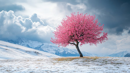 A solitary tree in full bloom, its vibrant pink blossoms contrasting with the snowy landscape and dramatic sky.