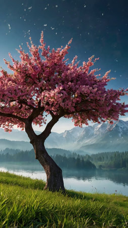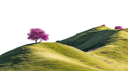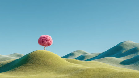 A striking scene features a vibrant pink tree standing alone on gentle green hills under a clear blue sky, inviting a sense of tranquility and beauty.