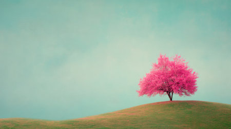 A stunning image of a vibrant pink tree standing alone on a gentle green hill, set against a soft blue sky, perfect for evoking peace and tranquility.