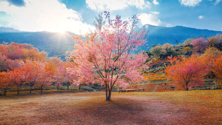 landscape of beautiful pink cherry blossom tree at evening, spring season