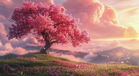 A single, large cherry blossom tree stands on a grassy hilltop, with a soft pink sunset in the background.