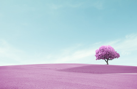One tree on open grassland with sky. color tone Style pastel Sweet romantic Abstract fantasy concept Beautiful romantic nature.