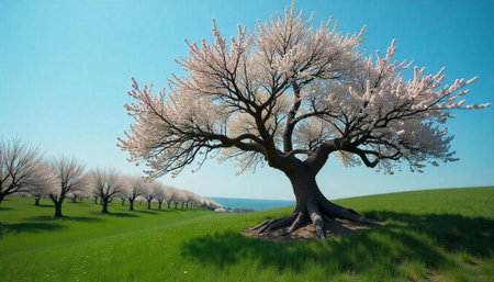 Blooming tree in a field on a sunny day