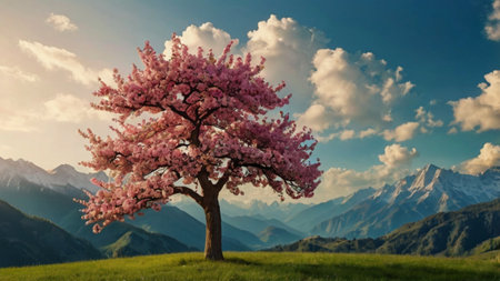 This stunning image showcases a vibrant pink tree atop lush green hills under a clear blue sky, embodying nature's tranquility and beauty.