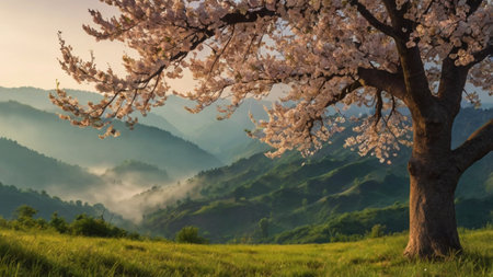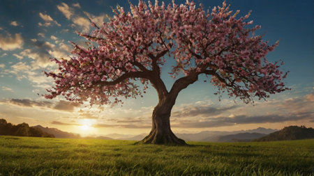 Cherry blossom tree in meadow at dawn generated by artificial intelligence