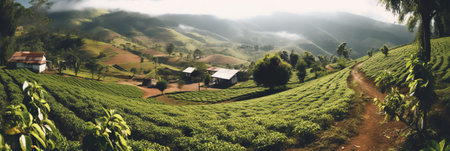 scenery of tea garden with farmhouse at sri lanka at dawn
