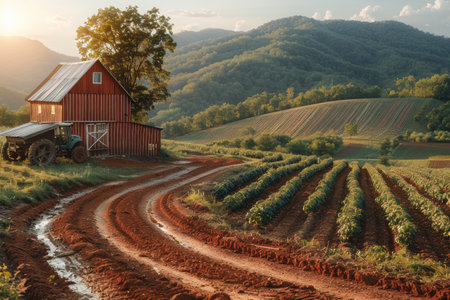 Fresh organic produce is being prepared for delivery amid a vibrant farm landscape bathed in warm sunlight, showing natures beauty and tranquility.