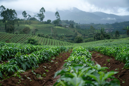 Lush green coffee plants are growing on a farm with rolling hills and mountains in the background