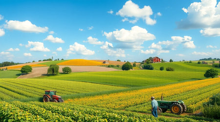 Expansive rolling green hills are adorned with meticulously cultivated fields displaying vibrant stripes of yellow sunflowers and purple lavender, interspersed with green wheat. A gentle stream meanders through a lush meadow where cows graze peacefully. In the distance, a wind turbine stands tall against a clear blue sky, and a tractor works the land, symbolizing modern agriculture. This idyllic rural scene evokes a sense of tranquility and the beauty of cultivated nature.