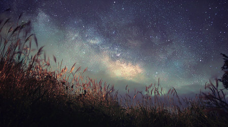 Milky Way over meadow at night with stars in the sky