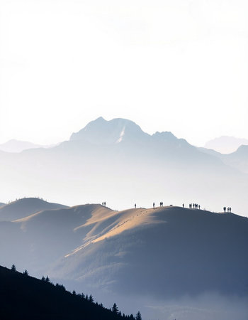 Silhouettes of people walking on the top of a mountain.