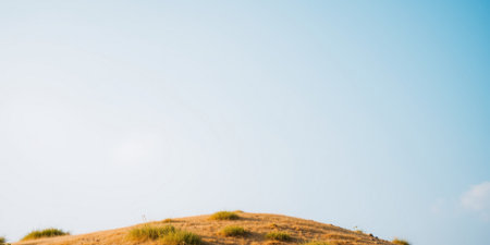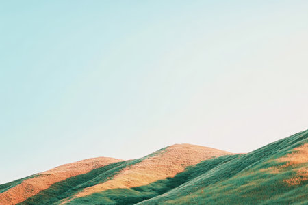 A breathtaking view of gentle hills illuminated by warm sunlight against a clear blue sky, ideal for showcasing nature's beauty and evoking a sense of tranquility.