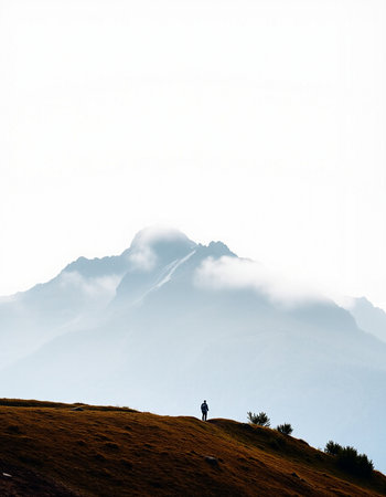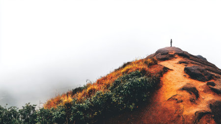 A solitary figure stands on the summit of a rugged, earthy-toned mountain, enveloped in thick white fog. A sense of achievement, freedom, and solitude in nature.