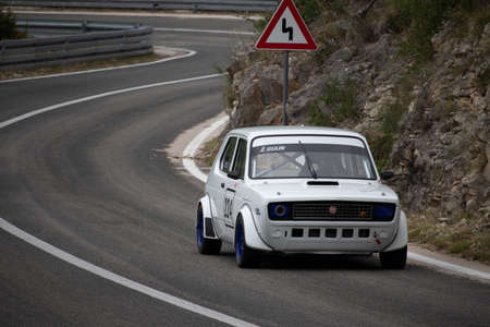 Skradin Croatia, June 2020 Simple white old Fiat modified for hill climb racing up hill, going through a bend at high speed