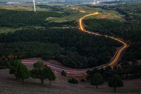 A serpentine mountain route glows with colorful streaks of headlights and taillights, set against a dramatic evening sky, with dark silhouettes of trees and rugged c