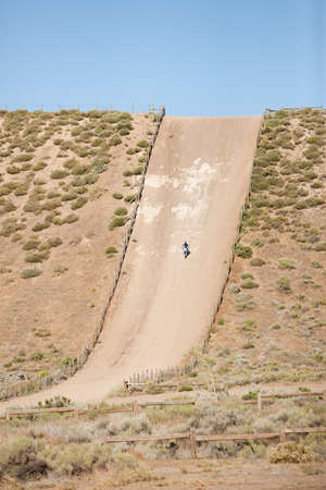 Motocross concept, a biker goes off-road making extreme skiing. In pursuit of adrinalin, sport concept. Dangerous sport.