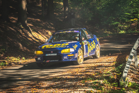 Miedzylesie, Poland - October, 6, 2019: Poland's Michal Pryczek and co-driver Jacek Pryczek in a Subaru Impreza 555 rally car during the 53rd Rally Dolnoslaski in Miedzylesie.