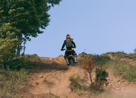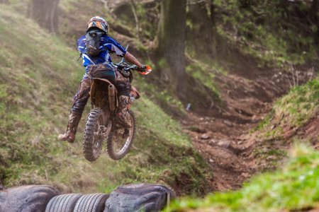 Professional enduro bike rider on action, dirt ride on the muddy road. Motocross sport.