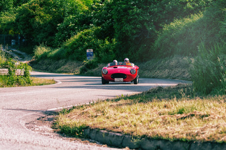 PESARO COLLE SAN BARTOLO , ITALY - MAY 17 - 2018 : STANGUELLINI 1100 SPORT BIALBERO 1949 on an old racing car in rally Mille Miglia 2018 the famous italian historical race (1927-1957)