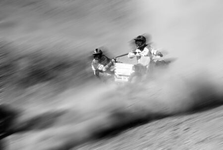 Two motorcyclist on off road vehicle. Motocross. Sports. A moving blur background. B/w
