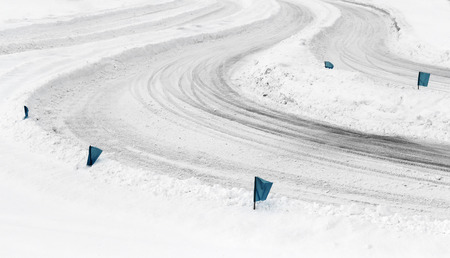 Sharp hairpin curve of narrow rural asphalt road in the mountains. Austrian Alps, Austria. Black and white image.