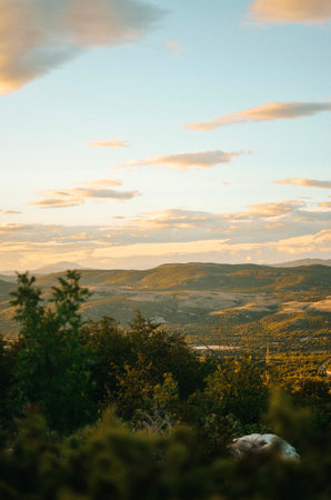View from the top of the mountain with forest on the sea at a beautiful bright sunset
