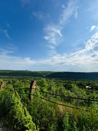 Beautiful countryside view featuring dense foliage and a vibrant blue sky.