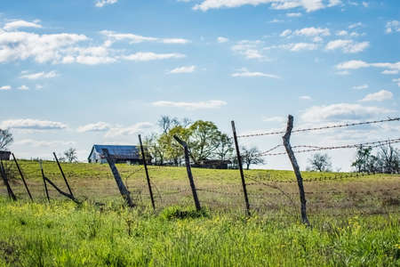 Country landscape of a haphazard barbed wire fence in focus bordering a bright, springtime pasture with a barn on the hill and blue sky and fluffy clouds.
