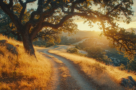 Warm amber hues fill the sky as a curved earth path leads past a timeworn tree, enveloped in peaceful rural charm and golden grasses.