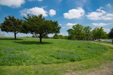 Local resident enjoys beautiful display of bluebonnet wildflowers and warm Spring weather at scenic farm near Dallas, Texas, USA. Blooming meadow prairie of state flower of Texas with mature trees