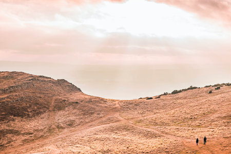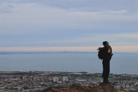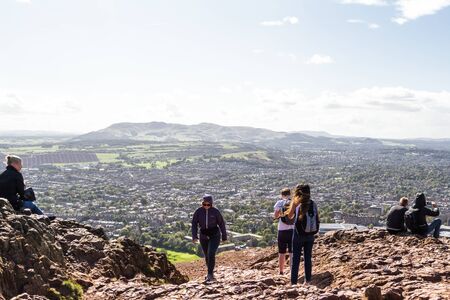 Edinburgh Scotland - September 13 2019: People enjoying the view from Arthur's seat the summit of the mountain in Holyrood Park, Edinburgh UK September 13, 2019