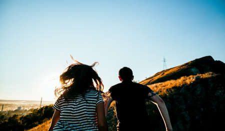 silhouette of a man and a woman in the open air, two young people in nature, silhouette at sunset