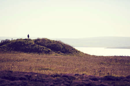 A woman walking on the hills at the North Sea coast in Brora Village, Highlands of Scotland, UK