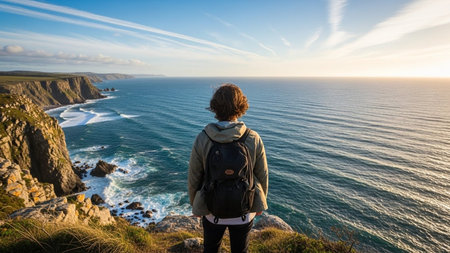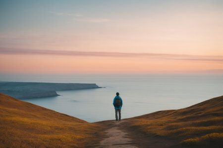 A contemplative man gazes out at the expansive ocean, reflecting on life and nature's beauty. The tranquil landscape invites moments of peace and solitude.