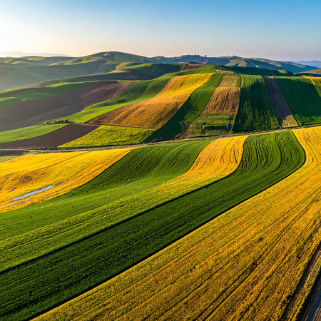 Vast vineyard fields create a colorful patchwork across rolling hills, illuminated by bright sunlight, showcasing an eco wine concept.
