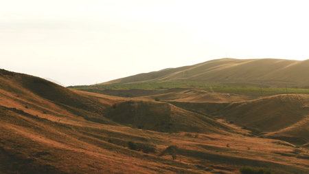 Panorama of golden hills in the morning mist, peaceful landscape.