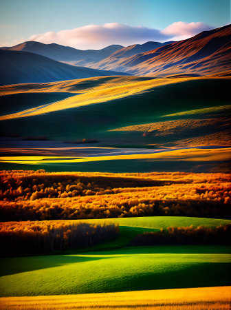 Captivating landscape of rolling hills and vineyards under a stunning sunset. The golden light illuminates the serene scene, evoking tranquility.