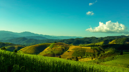 view of green rice fields terrace mountain in countryside Land with grown plants of paddy and sea of fog at Pa Pong Piang, Thailand.