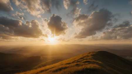 A breathtaking view of golden sunlight piercing through clouds over rolling hills, creating a peaceful and majestic landscape.