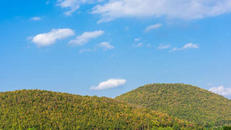 landscape mountain with green forest and blue sky with clouds