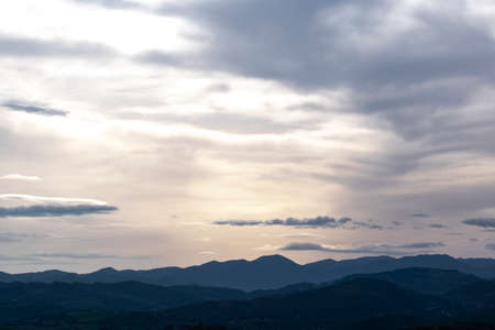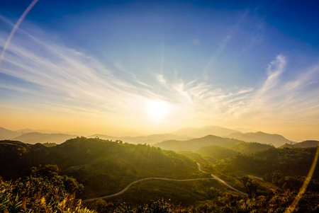 Mountain range and beautiful sunset scene view. Sky clouds with sunlight in the evening. Horizon sky landscape and dusk sky background